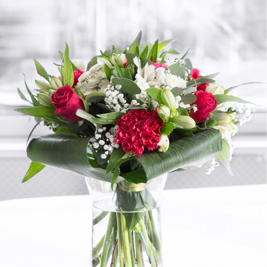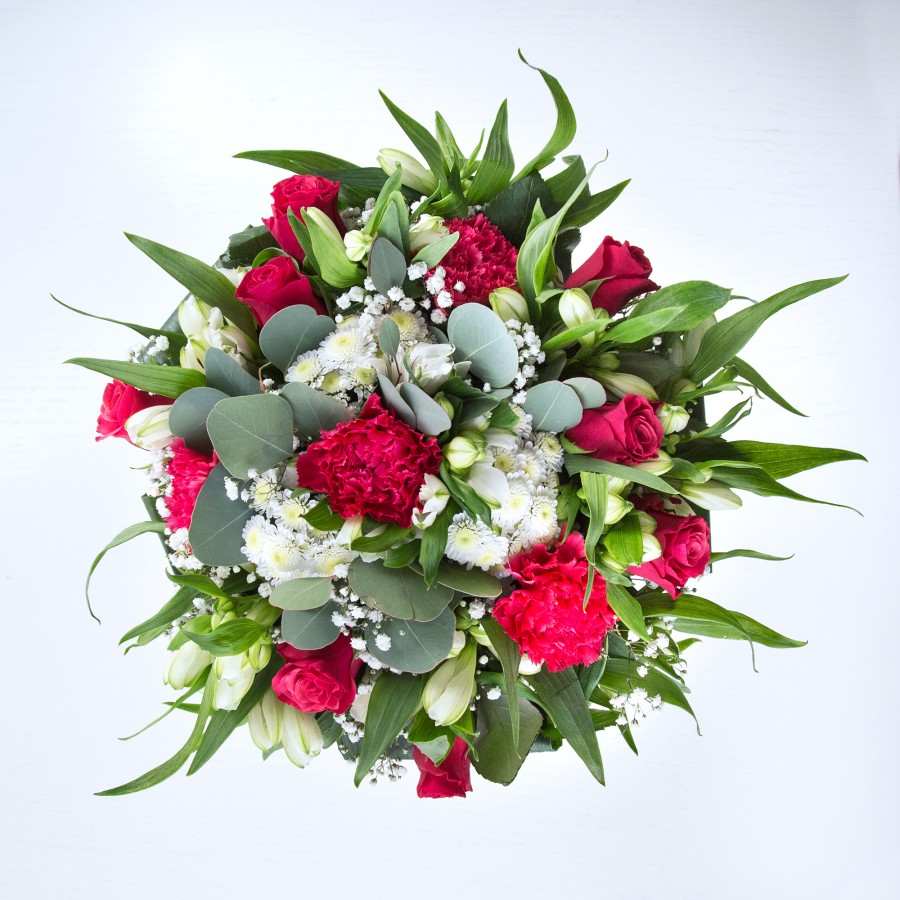 Celebrate beauty and sophistication with our Elegant Harmony bouquet. This stunning arrangement features sweet white chrysanthemums and gypsophila, beautifully paired with rich red roses and carnations. Accented with white alstroemeria and aspidistra leaves, each flower is hand-selected to ensure exceptional quality and freshness.